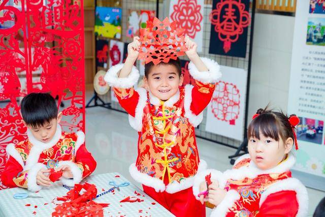 在“灵动剪纸”环节,孩子们化身“小小非遗传承人”,将红纸剪制成云肩、服饰、窗花等精美作品。大兴七幼的孩子们将剪纸与云肩非遗元素结合,指尖翻飞间,祥云、蝴蝶等图案跃然纸上,云肩造型精巧灵动;瀛海四幼的小模特们身着自制剪纸服饰登台,服饰上的花鸟、瑞兽纹样,处处体现童趣巧思;礼贤中心园的孩子们把诗词意境融入剪纸,让两种传统艺术形式碰撞出新的火花;七幼魏善庄园的孩子们围绕神话、民俗等主题进行创作,使非遗技艺焕发出稚嫩却鲜活的生机;旧宫二幼则通过剪纸传递新年祝福,展现剪纸艺术的喜庆内涵。