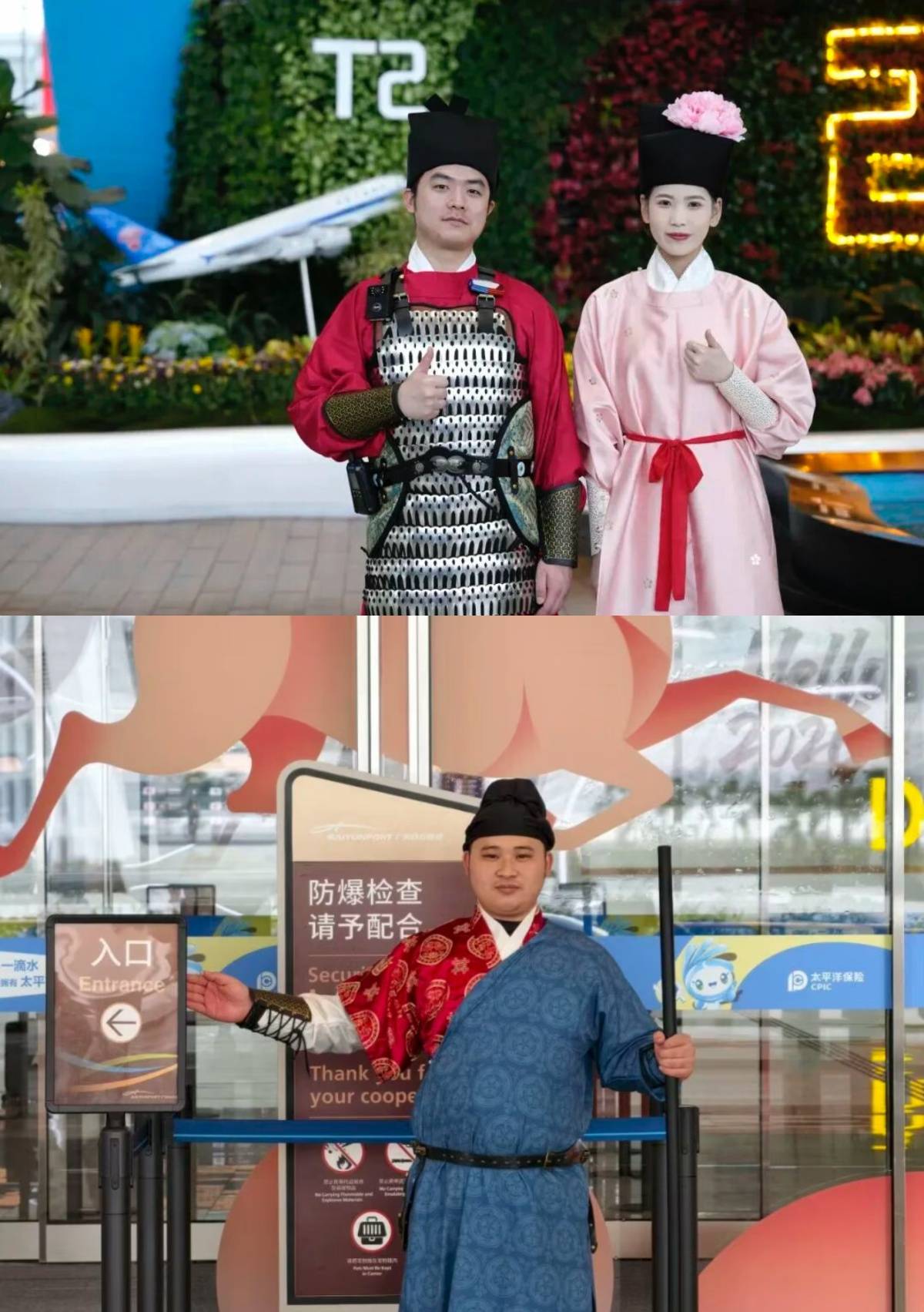 据白云机场官方消息,工作人员穿汉服执勤是机场一系列文化活动的开篇。在此前的汉服执勤活动中,T2航站楼工作人员服饰参考宋代规制,其中女安保人员发间点缀粉色牡丹簪花,寓意富贵吉祥,于细节处传递新年祝福。同时,工作人员均掌握宋代“叉手礼”及“客官,这边请”等雅致服务用语。T3航站楼工作人员则身着唐装,圆领袍衫配织锦纹样,襦裙搭飘逸披帛,还有“带刀侍卫”鞠躬作揖。